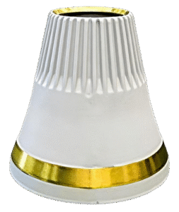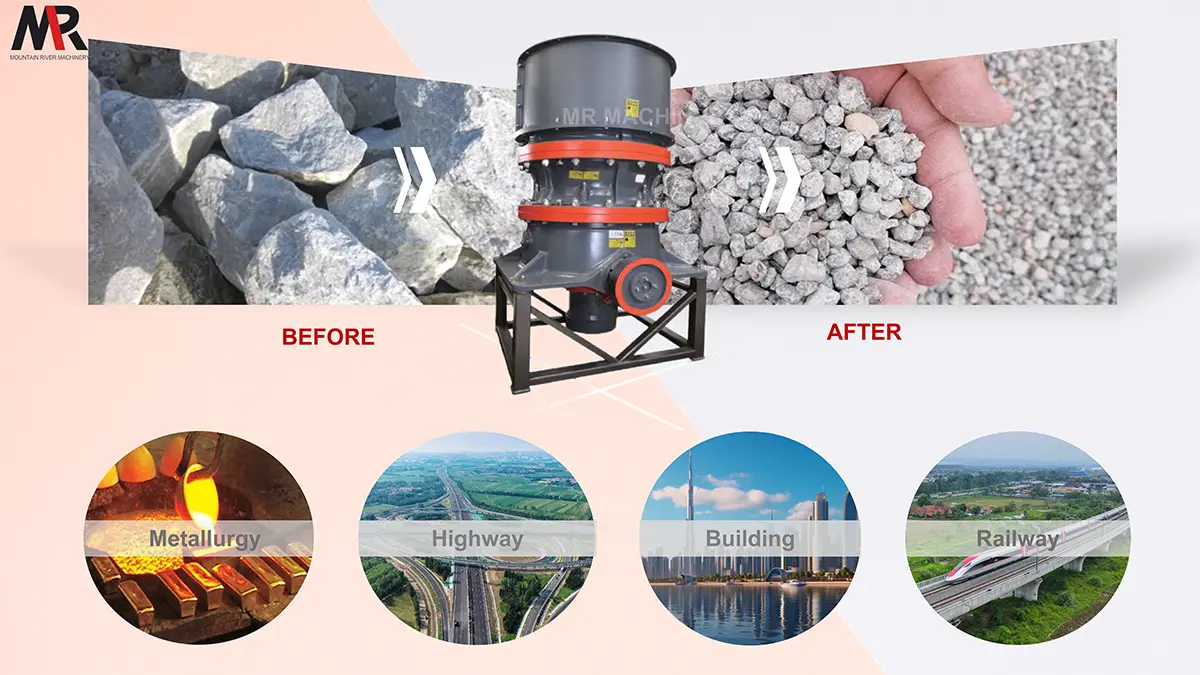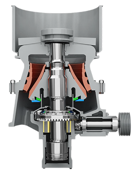 O motor aciona a rotação da bucha excêntrica, fazendo com que o cone móvel oscile e esmague o material na câmara de britagem por compressão e impacto. O sistema hidráulico ajusta a saída de descarga e a proteção contra sobrecarga: a saída de descarga é ajustada elevando e abaixando o cone móvel por meio do cilindro hidráulico. Quando um objeto estranho não esmagável entra, o acumulador fornece amortecimento de pressão, o sistema hidráulico libera a pressão para abaixar o cone móvel e descarregar o objeto, e então reinicia automaticamente.