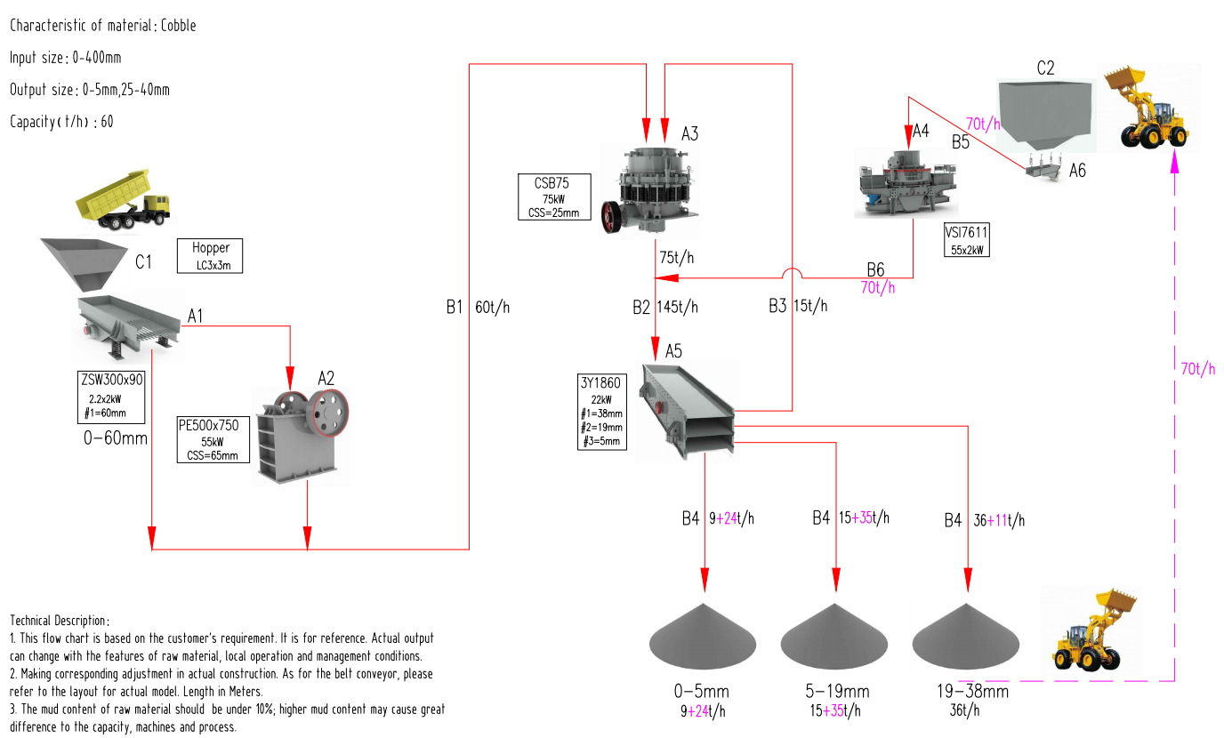 Este cliente desejava adquirir uma linha de britagem para pedra de rio. O material de alimentação tem aproximadamente 400 mm, e o cliente precisava que fosse britado em três granulometrias: 0–5 mm, 5–19 mm e 19–38 mm, produzindo tanto brita quanto areia fina. Esses agregados para construção seriam utilizados na construção de uma usina hidrelétrica. Além disso, o cliente solicitou que, conforme a necessidade de produção, o material de 19–38 mm pudesse ser rebritado para obter as outras duas granulometrias: 0–5 mm e 5–19 mm.